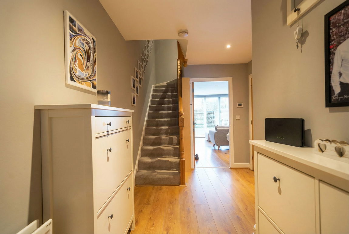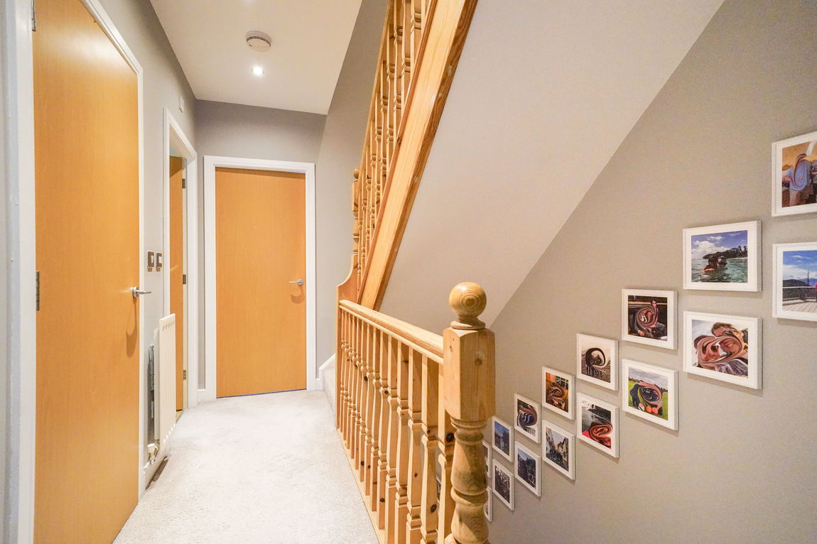 With ceiling spot lights, airing cupboard, stairs rising to second floor master bedroom and doors leading off to