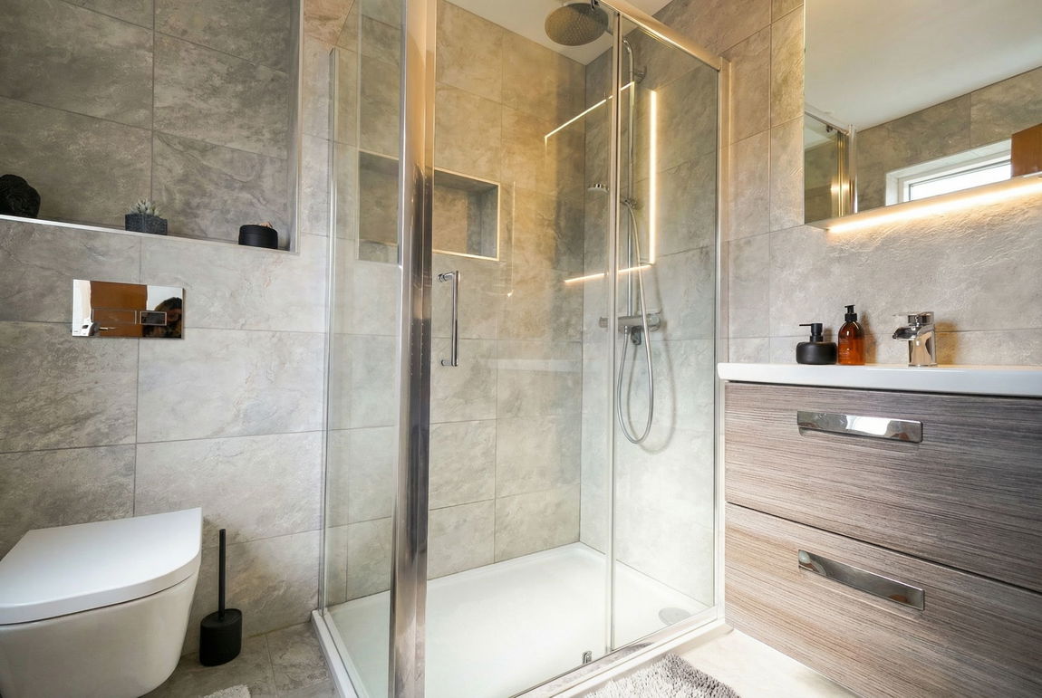 Being re-fitted with a three piece white suite comprising of a large shower enclosure with thermostatic rainfall shower and additional shower attachment, floating vanity wash hand basin and a low flush W.C. Complementary tiling to water prone areas, tiled flooring, obscure double glazed window to rear, ladder style radiator and spot lights to ceiling