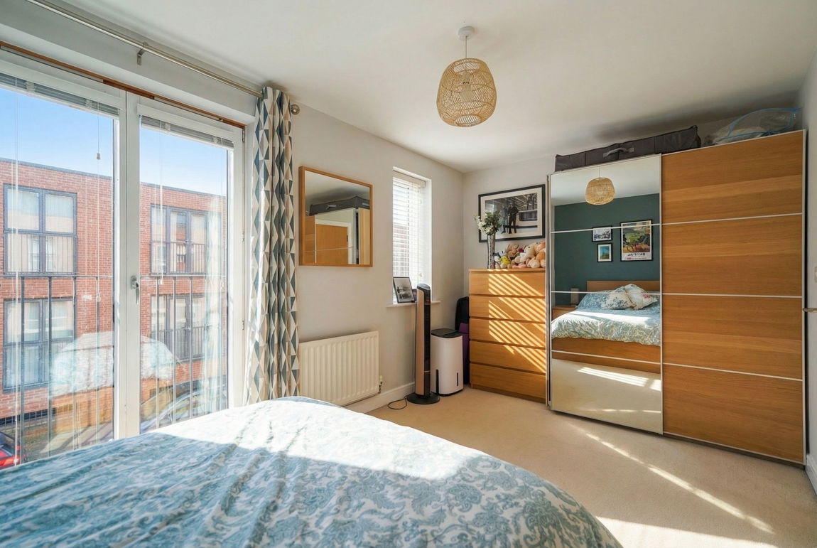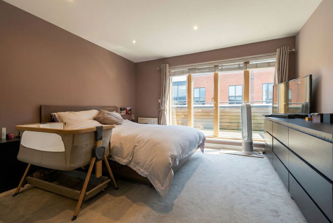 With double glazed window to rear elevation, double glazed full height windows incorporating door to Southerly facing roof terrace, access to loft space, two radiators, triple fitted wardrobes, ceiling spot lights and door to