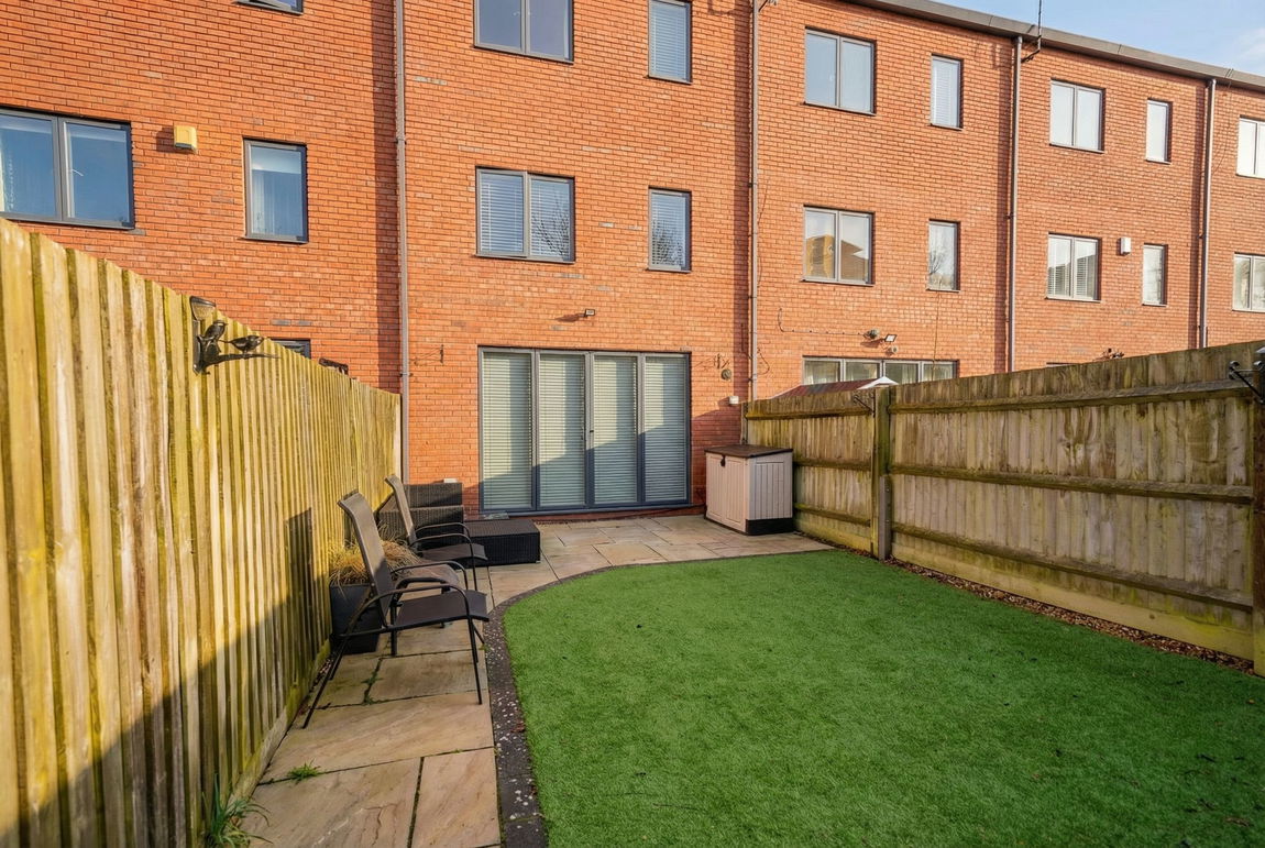 With Indian stone patio area, artificial lawn, fencing to boundaries and gated rear access leading to