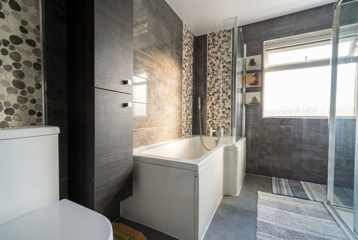 Being fitted with a four piece white suite comprising a panelled bath with shower attachment and glazed screen, separate shower enclosure with feature shower, vanity wash hand basin and a low flush W.C. LED mirror, tiling to walls, tiled flooring, obscure double glazed window to rear, ladder style radiator and spot lights to ceiling