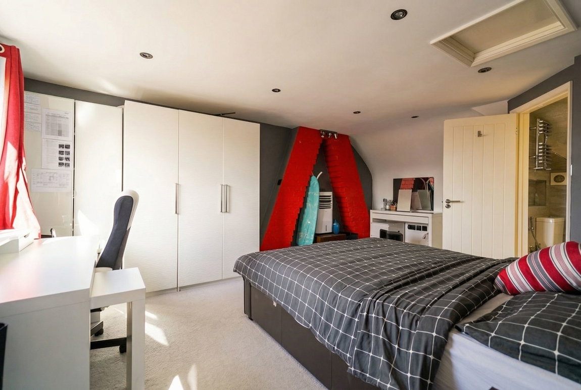 With ceiling light point, electric fire with marble hearth, vertical radiator, roof window and opening into
