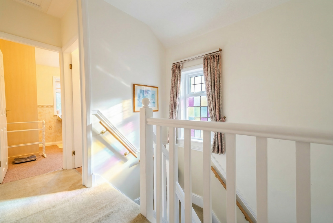 With ceiling light point, leaded window to side, loft hatch, radiator and doors leading off to