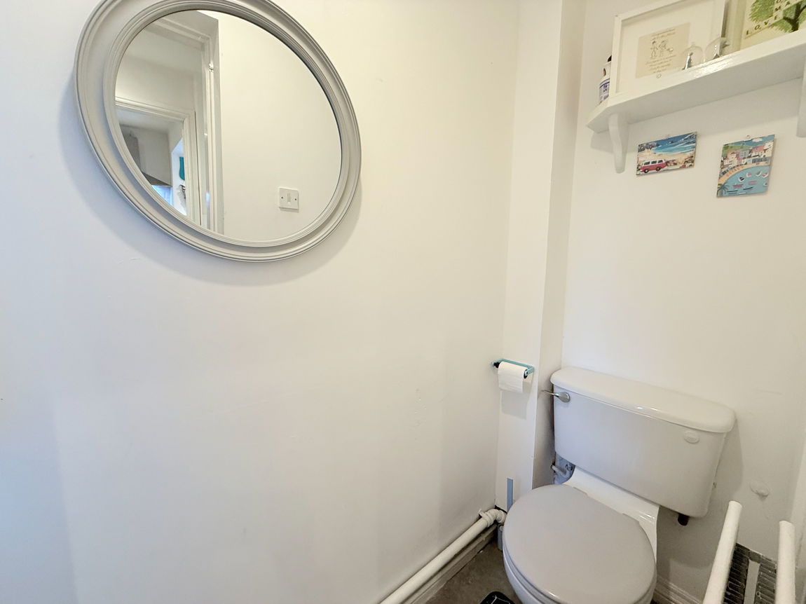 With low flush W.C, wall mounted corner wash hand basin with tiled splashback, obscure double glazed window to rear, tiled flooring, radiator and ceiling light point