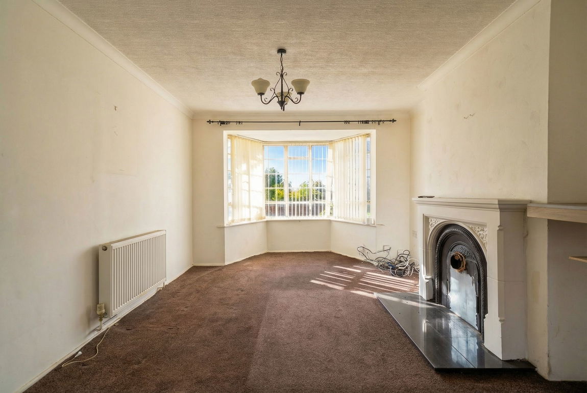 With single glazed bay window to front elevation, single glazed windows incorporating a door leading out to the rear garden, two radiators, two ceiling light points and iron fireplace with tiled hearth and wooden surround