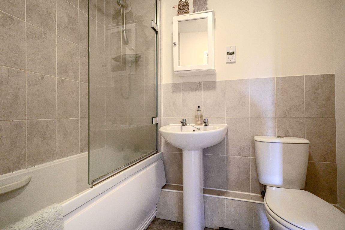 Fitted with a white three piece suite comprising panelled bath with thermostatic shower over and glazed screen, pedestal wash hand basin and low flush WC, central heating radiator, shaver socket, complementary tiling to splashback areas, Karndean LVT tiling to floor, ceiling light point and extractor