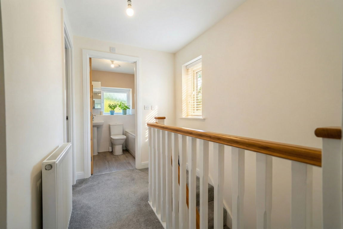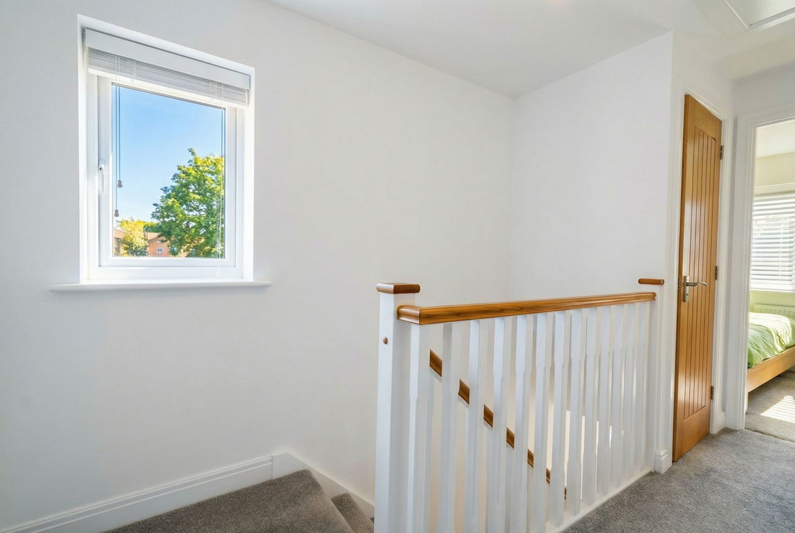 With ceiling light point, radiator, over stairs storage cupboard, double glazed window to side, loft hatch and oak doors leading off to