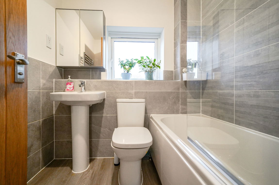 Being fitted with a three piece white Roca suite comprising a panelled bath with thermostatic shower over and glazed screen, pedestal wash hand basin and a low flush W.C. Tiling to water prone areas, wood effect flooring, obscure double glazed window to front, ladder style radiator and ceiling light point