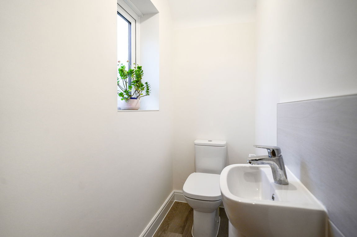 With low flush W.C, pedestal wash hand basin with tiled splashback, obscure double glazed window to side, wood effect flooring, radiator and ceiling light point