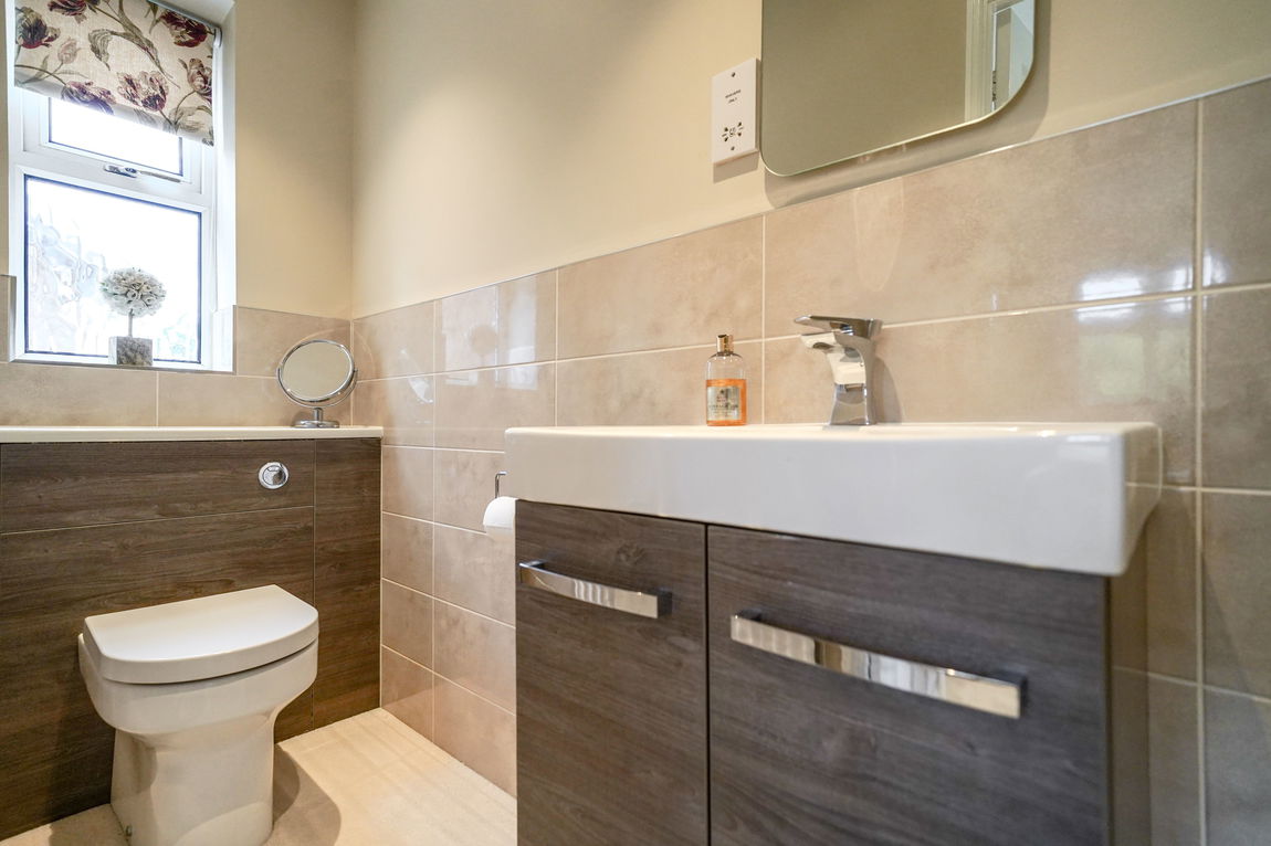 With low flush W.C, corner wash hand basin with tiled splashback, obscure double glazed window to front, radiator and ceiling light point
