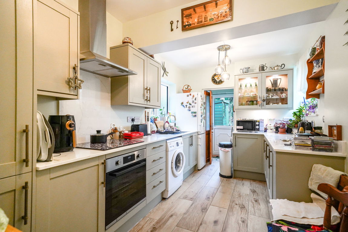 Being re-fitted with a range of wall, drawer and base units with complementary stone work surfaces over, inset sink with mixer tap, four ring induction hob with extractor canopy over and inset electric oven. Space and plumbing for washing machine, space for fridge/freezer, wood effect flooring, radiator, ceiling light point, double glazed windows to sides and door to