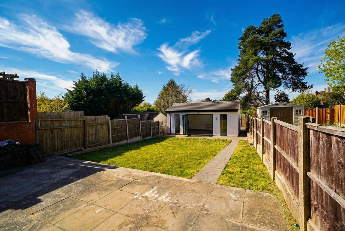 Having a paved patio area with steps leading down to lawn, fencing to boundaries and pathway leading down to a workshop/gym