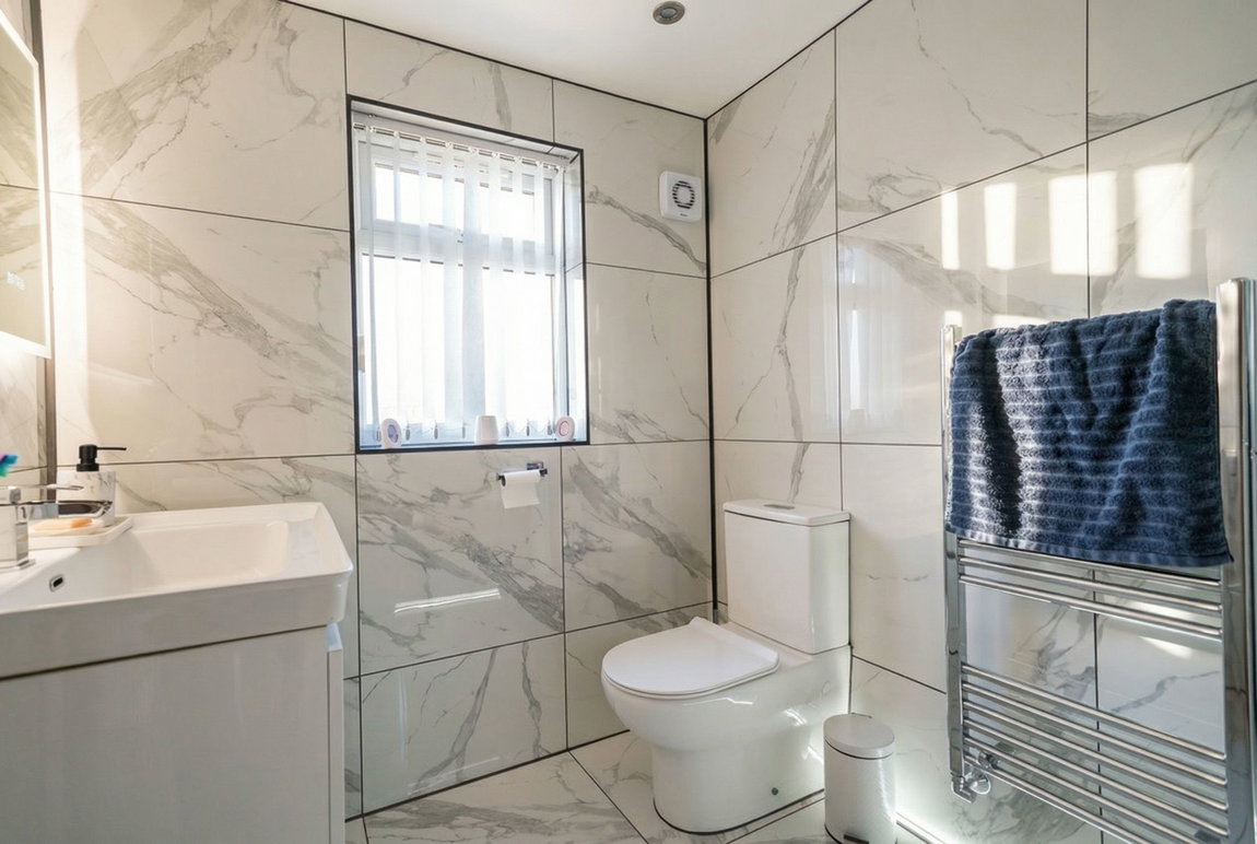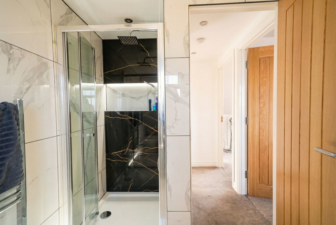 Having a shower cubicle with thermostatic rainfall shower over, low flush WC, over-sized vanity wash hand basin, complementary tiling to walls and floor, extractor, ceiling spot-lights, ladder style central heating radiator and an obscure UPVC double glazed window to the rear elevation