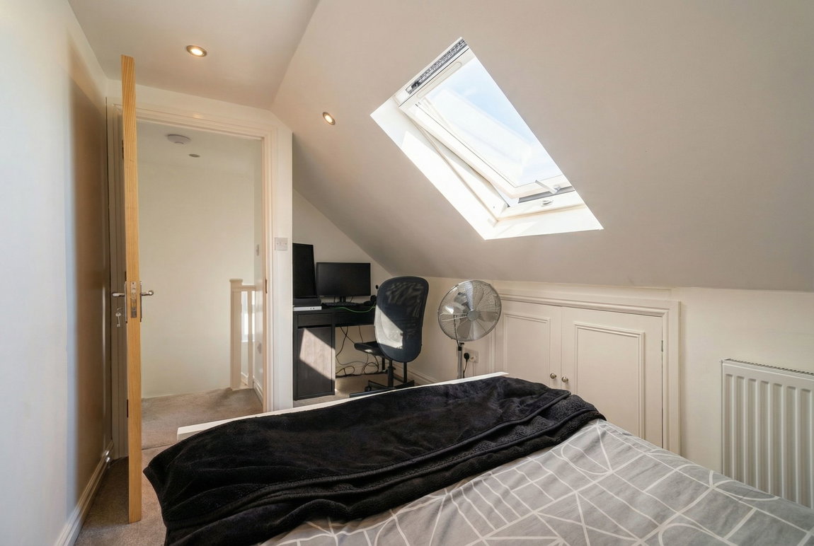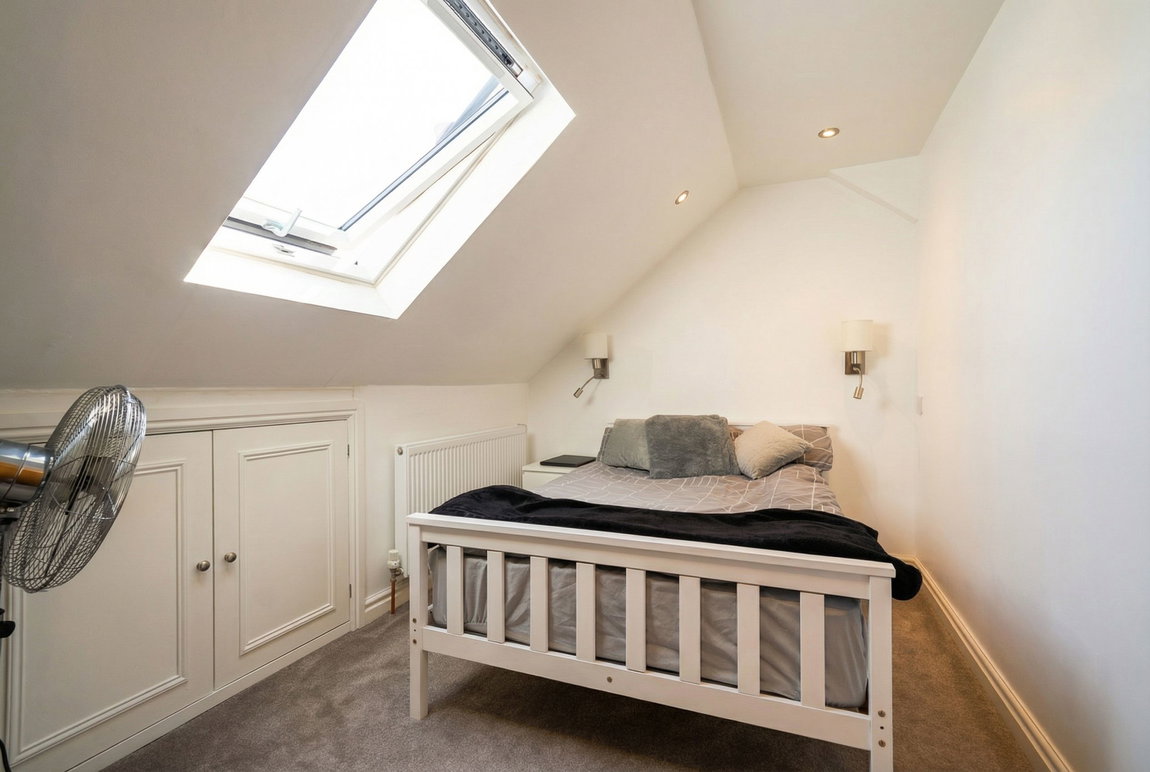 Having a Velux window, central heating radiator, storage to eaves and ceiling spot-lights