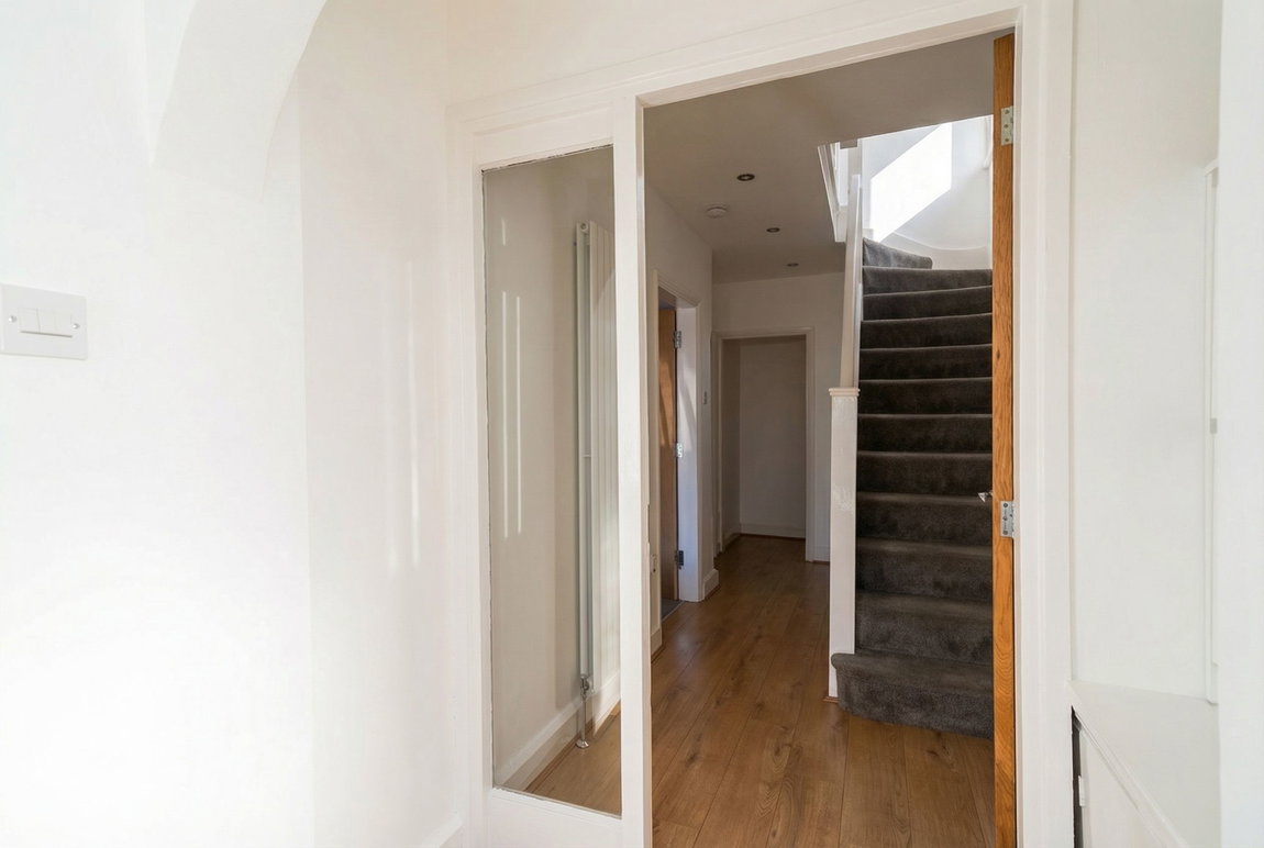 With wood effect flooring, vertical central heating radiator, ceiling spot-lights, stairs leading off to the first floor, door to under-stairs storage cupboard and doors leading off to: