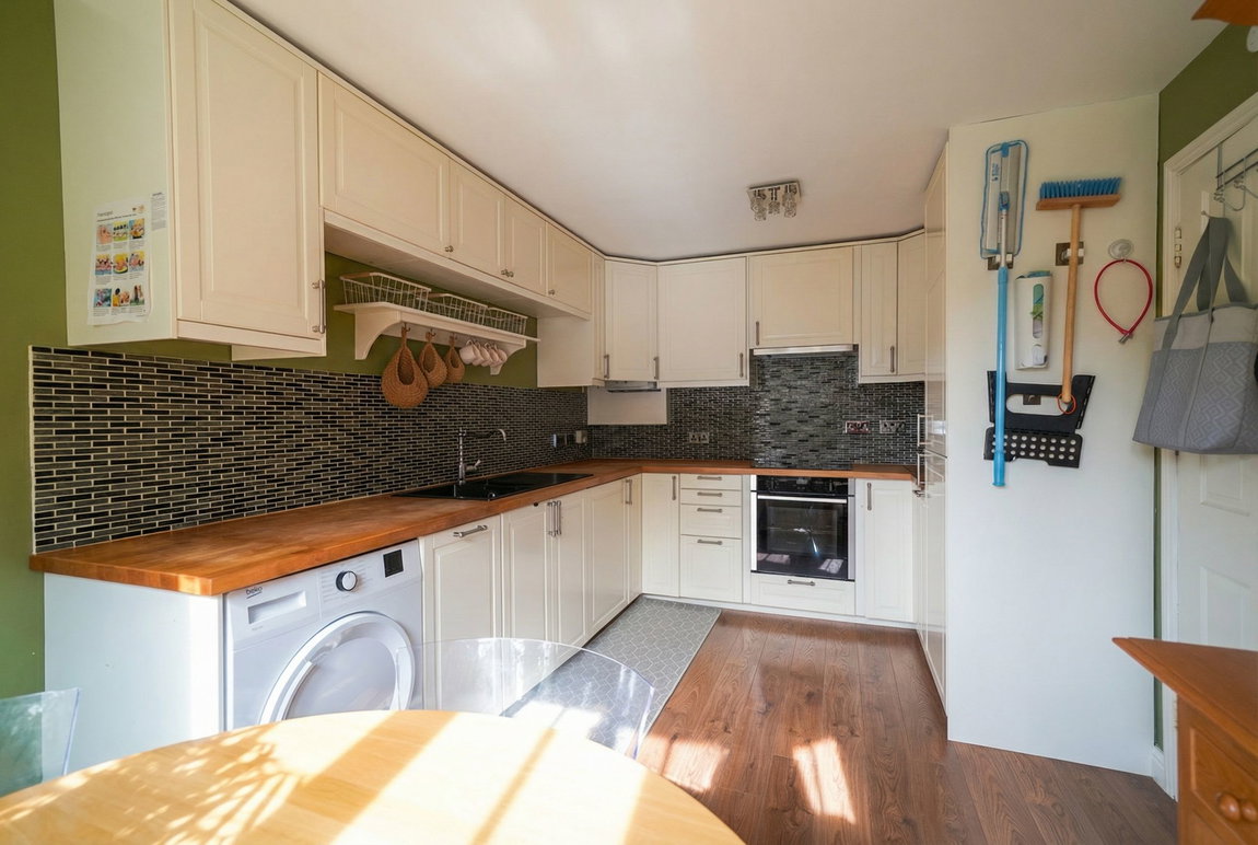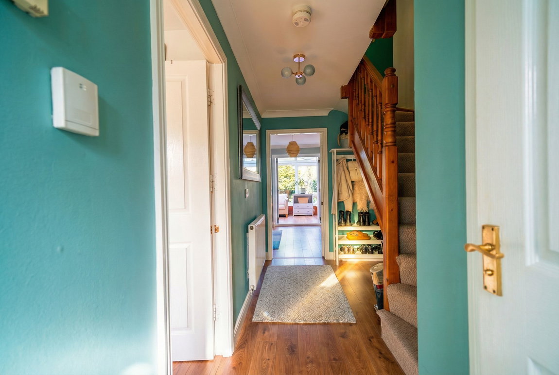 With ceiling light point, central heating radiator, wood effect flooring, stairs leading to the first floor accommodation with useful under-stairs storage cupboard and doors leading off to: