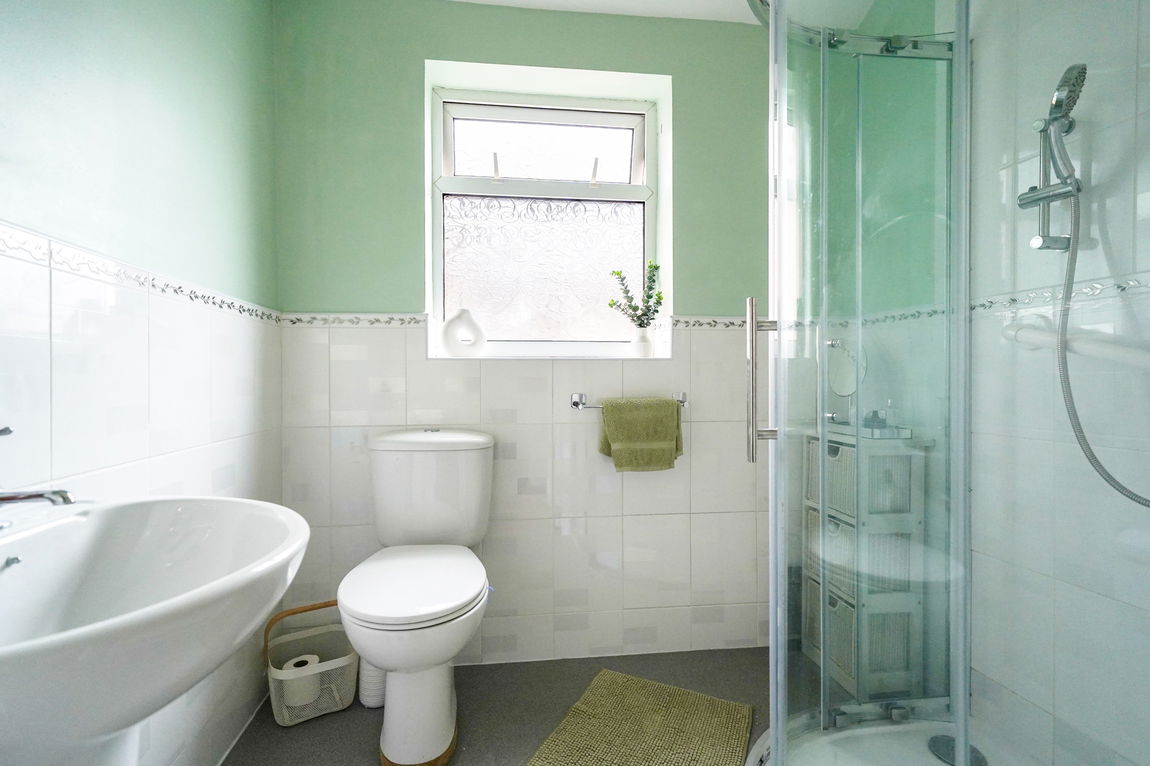Being fitted with a three piece white suite comprising a corner shower enclosure, pedestal wash hand basin and a low flush W.C. Tiling to water prone areas, obscure double glazed window to rear and lighting