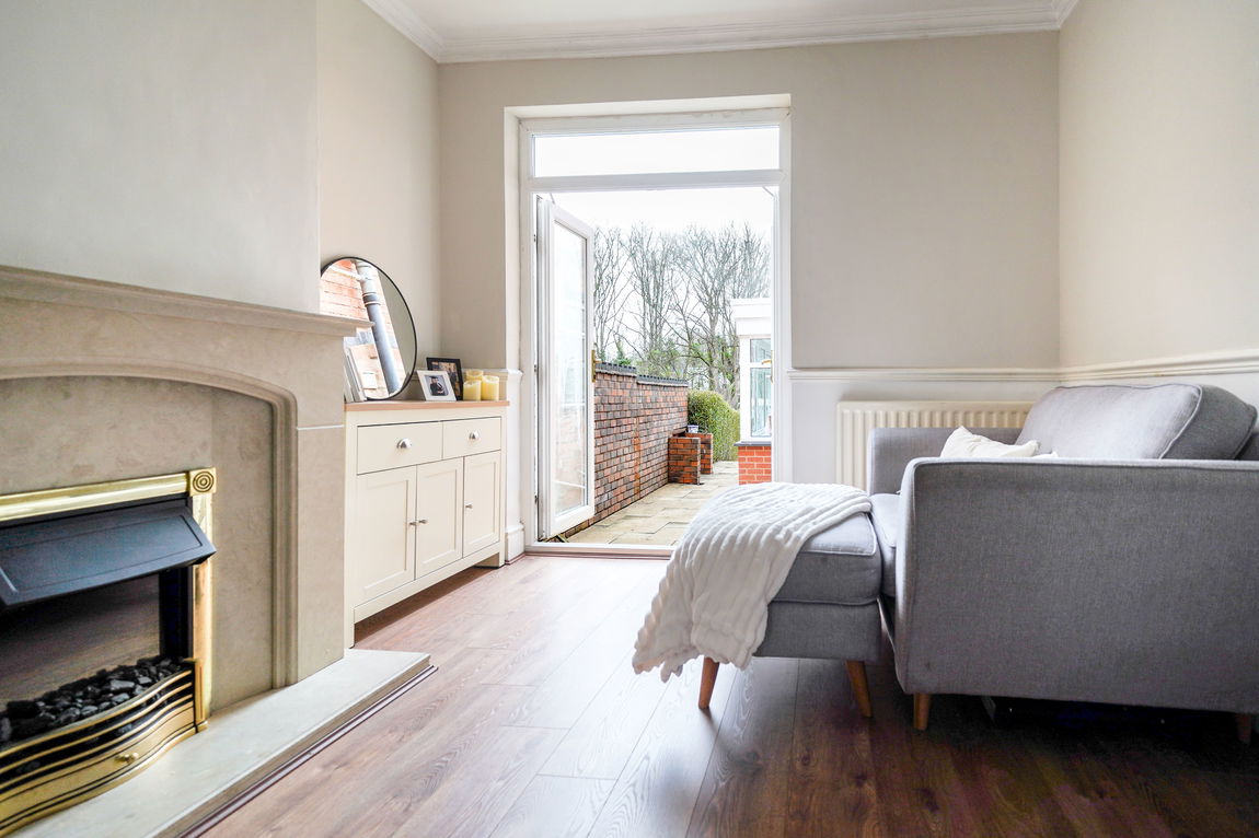 With ceiling light point, radiator, wood effect flooring, stone fireplace with electric coal effect fire and double glazed French doors leading out to the rear garden