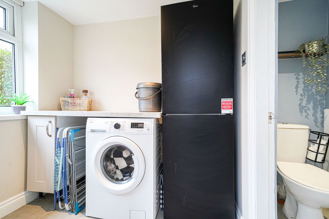 With fitted base units, space and plumbing for washing machine, tiled flooring, window to rear and door to