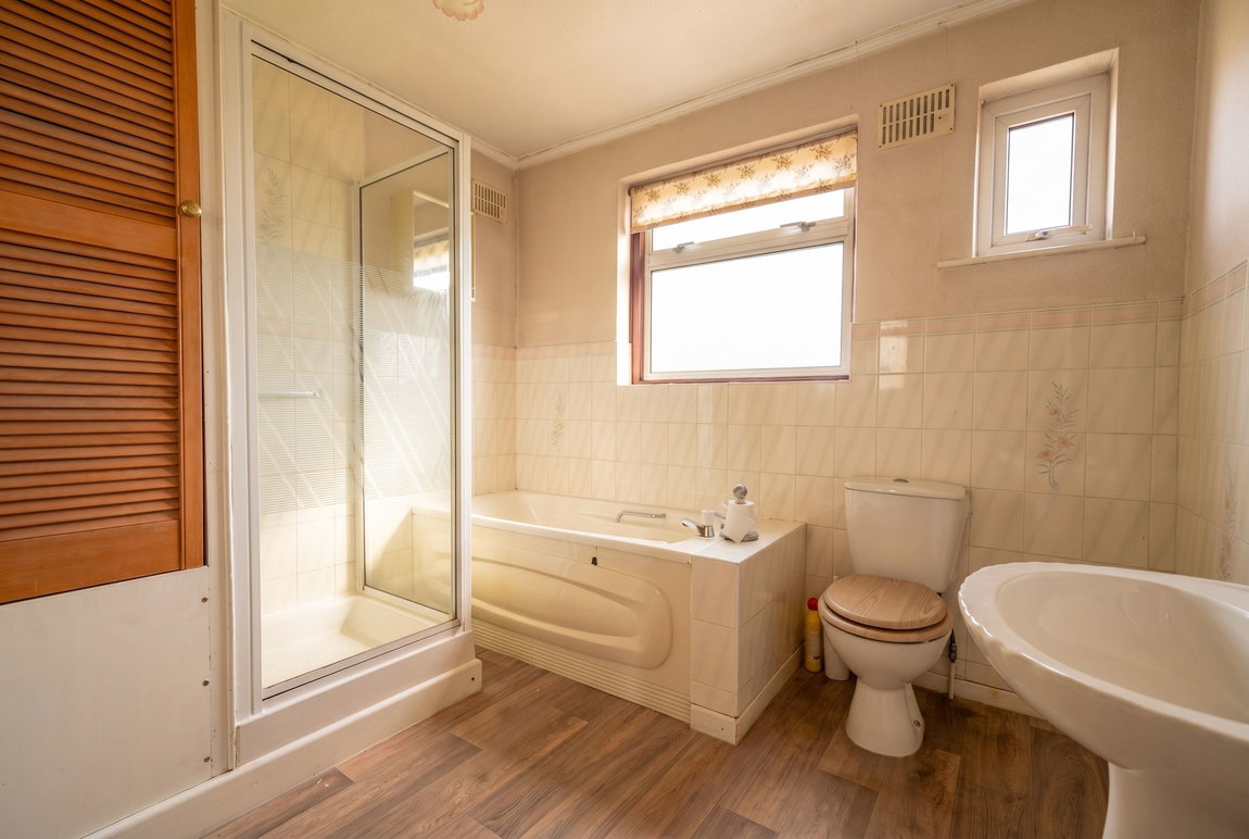 Having a low flush WC, panelled bath, pedestal wash hand basin and shower cubicle, two obscure UPVC double glazed windows to the rear elevation, two ceiling light points, wood effect flooring and central heating radiator