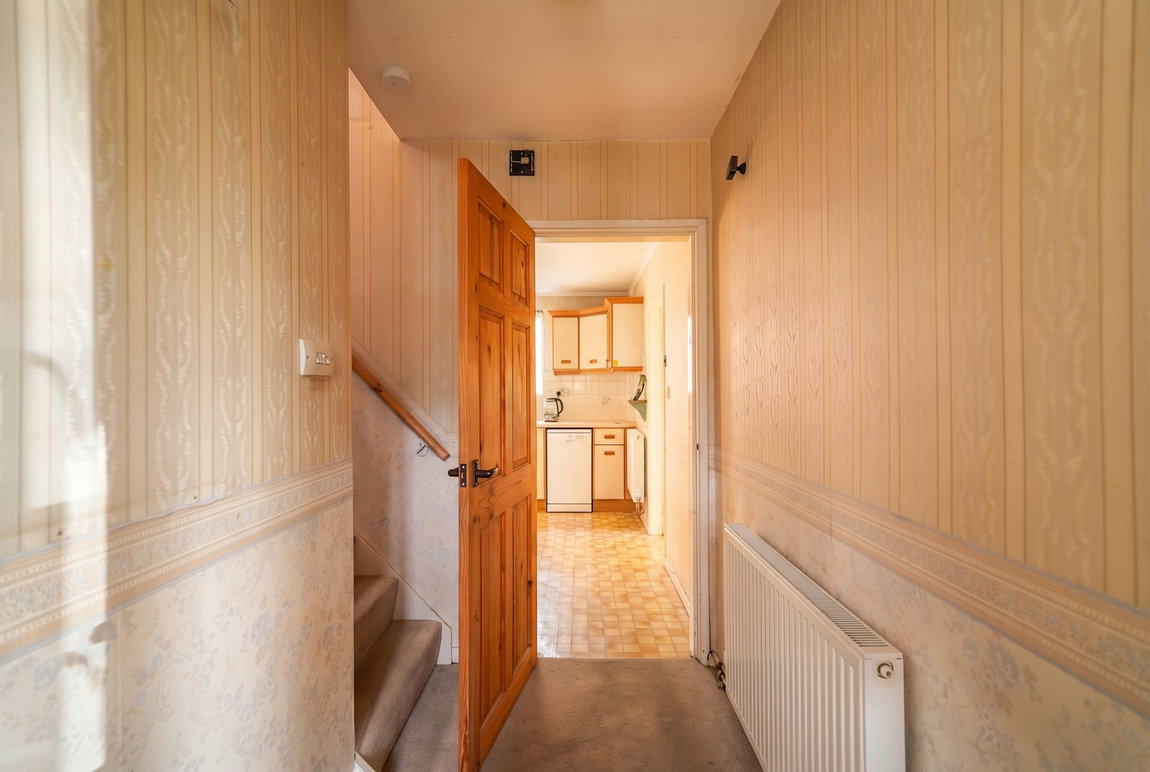 The kitchen is fitted with a range of wall and base mounted storage units with work surfaces over incorporating sink and drainer unit, tiling to splash-back areas, space and plumbing for washing machine, space for a cooker with extractor fan over, space for a dishwasher, UPVC double glazed window to the rear elevation, ceiling strip light, central heating radiator and door opening to the side passageway
