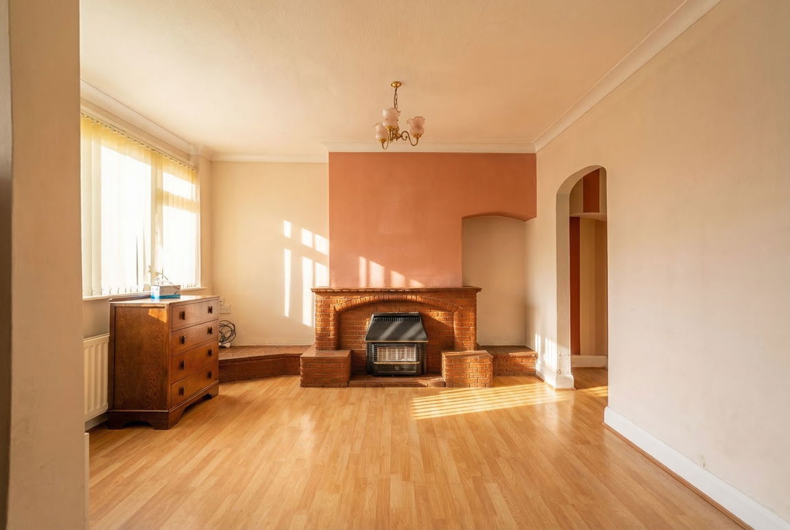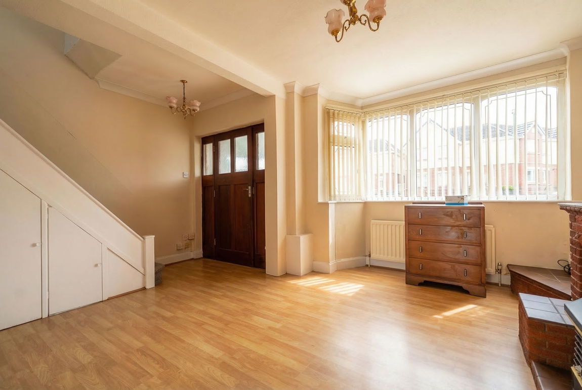 With double glazed bay window to front elevation, two radiators, two ceiling light points, wood effect flooring, brick built fireplace, stairs rising to first floor with under stairs storage cupboard and archway to