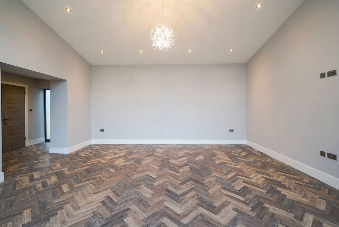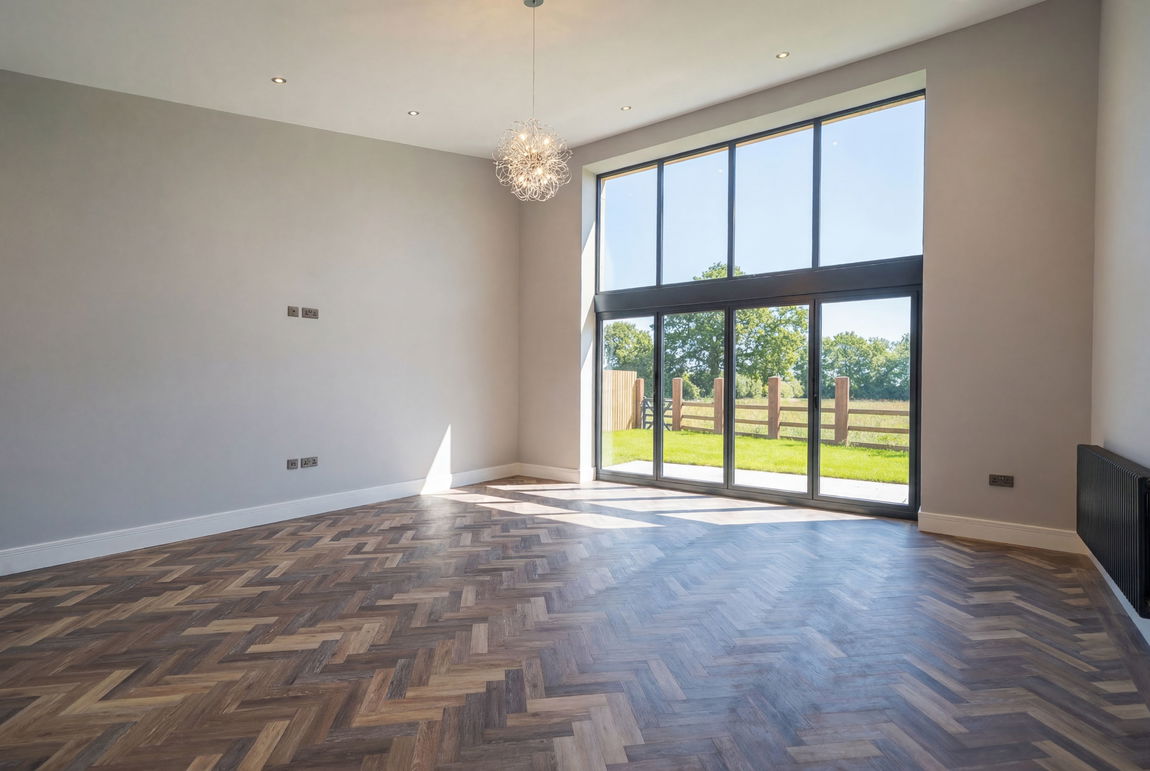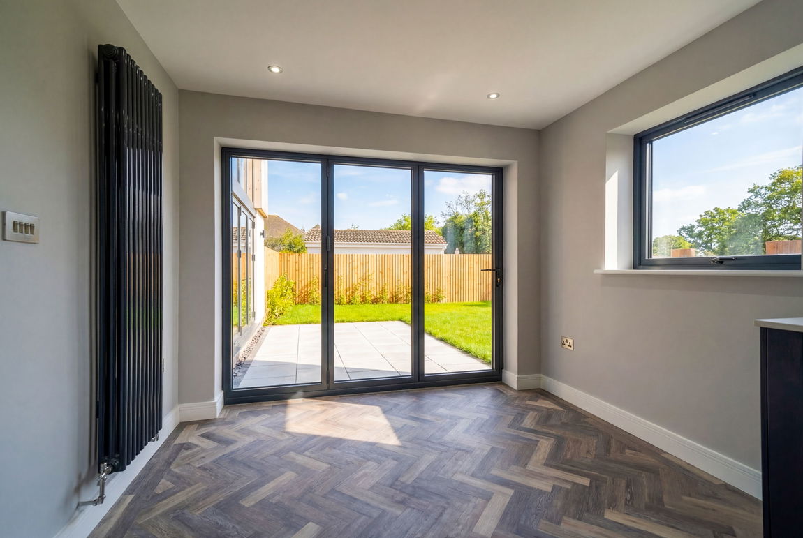 A beautiful and exceptionally spacious lounge offering a bright, open feel. The room features large windows and bi-fold doors opening directly onto the garden, allowing natural light to flood the space. Finished with LVT flooring, the living room benefits from tall, sloped ceilings that add character, ceiling spotlights alongside a central light point, a long radiator, TV point, and ample sockets, creating a stylish yet comfortable living area ideal for relaxing or entertaining.