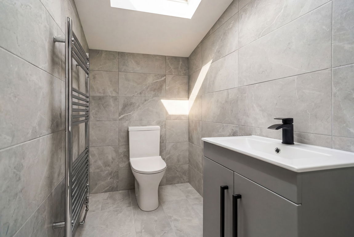 A contemporary ensuite finished to a high standard, featuring a skylight that floods the space with natural light, complemented by ceiling spotlights. The walls and floor are fully tiled in stylish grey tones. The bathroom includes a modern walk-in curved shower with black-framed screen, waterfall shower head and additional handheld attachment. WC, ladder style radiator, extractor fan, and a sleek vanity unit with sink and grey storage cupboards, finished with matte black fittings for a modern touch.