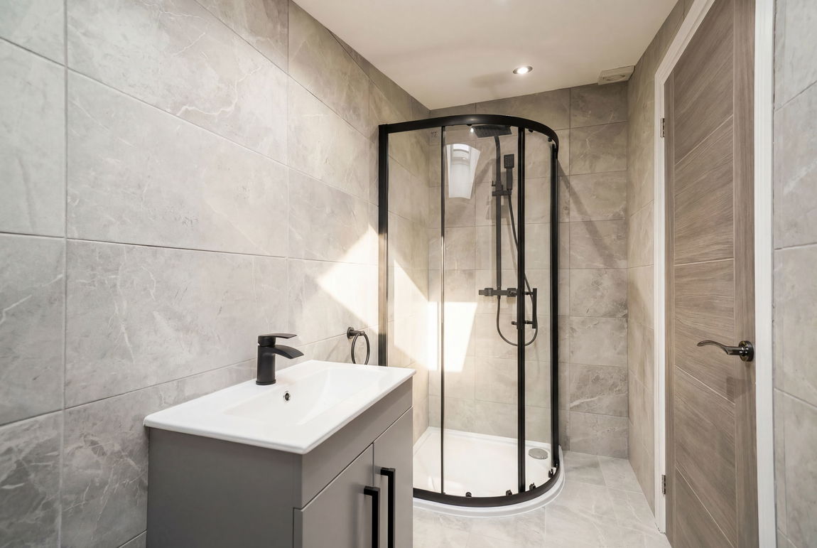 A contemporary ensuite finished to a high standard, complemented by ceiling spotlights. The walls and floor are fully tiled in stylish grey tones. The bathroom includes a modern walk-in curved shower with black-framed screen, waterfall shower head and additional handheld attachment. WC, ladder style radiator, extractor fan, and a sleek vanity unit with sink and grey storage cupboards, finished with matte black fittings for a modern touch.