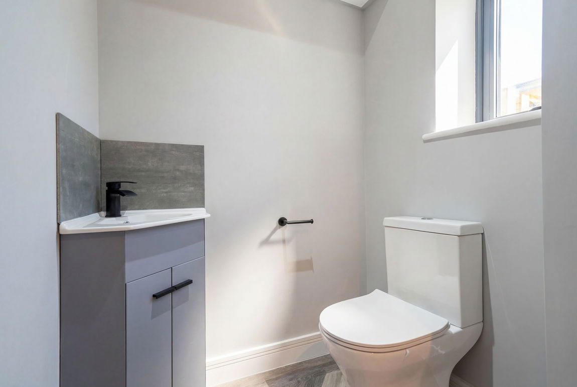 A modern downstairs WC featuring a window and extractor fan for ventilation. The space includes a WC and a sleek sink with contemporary grey cupboard storage, complemented by dark grey tiled splashback areas. Finished with practical and stylish LVT flooring.