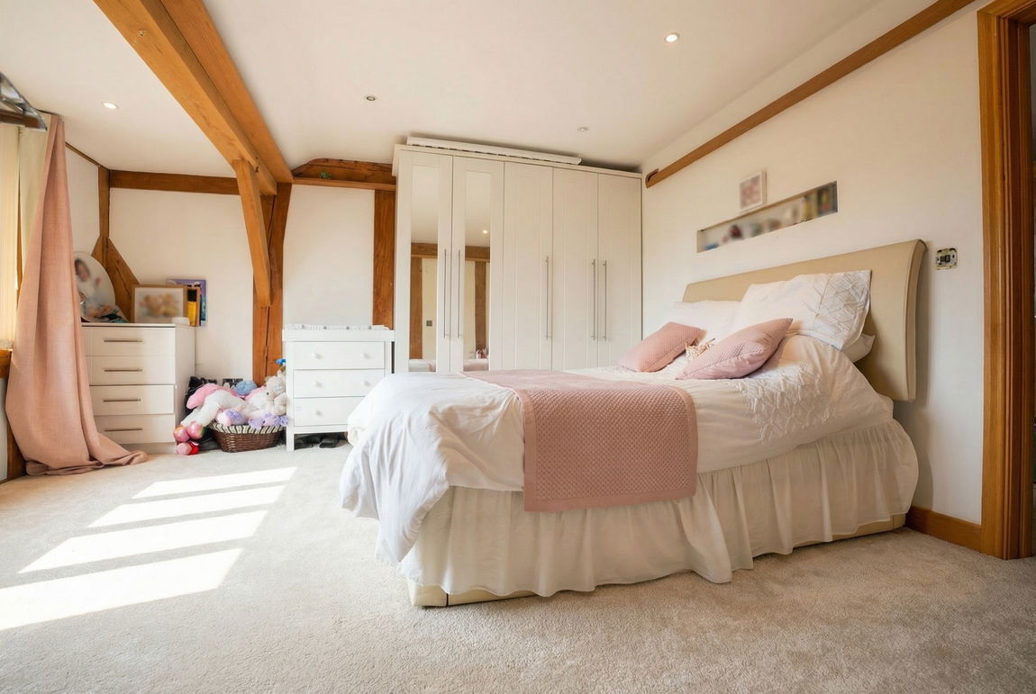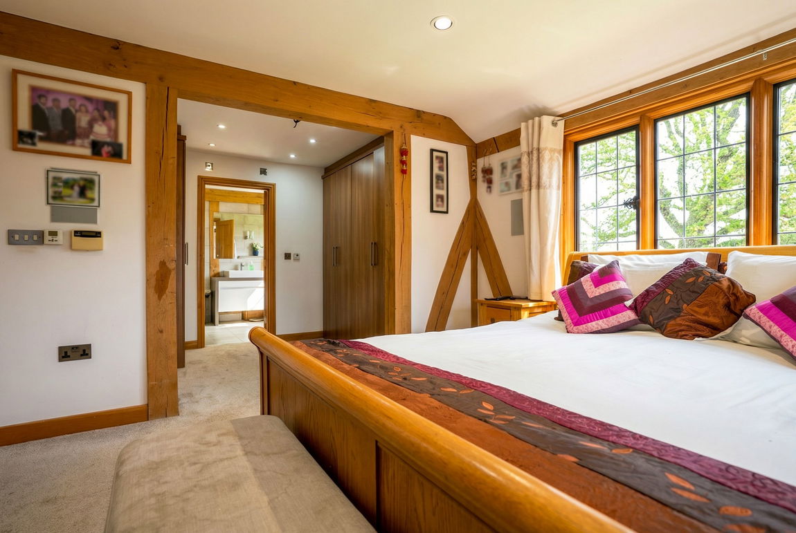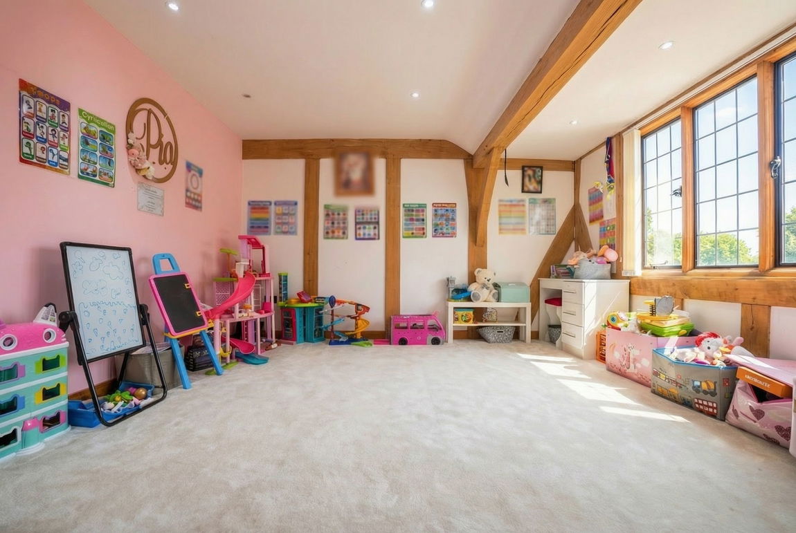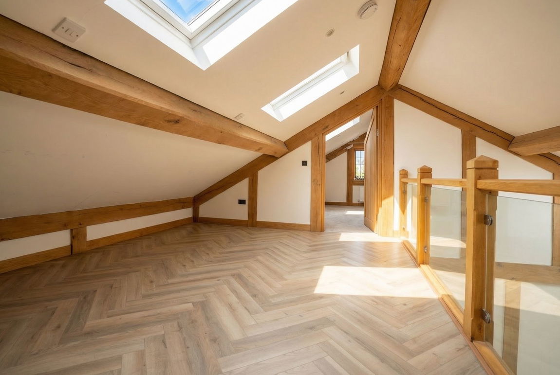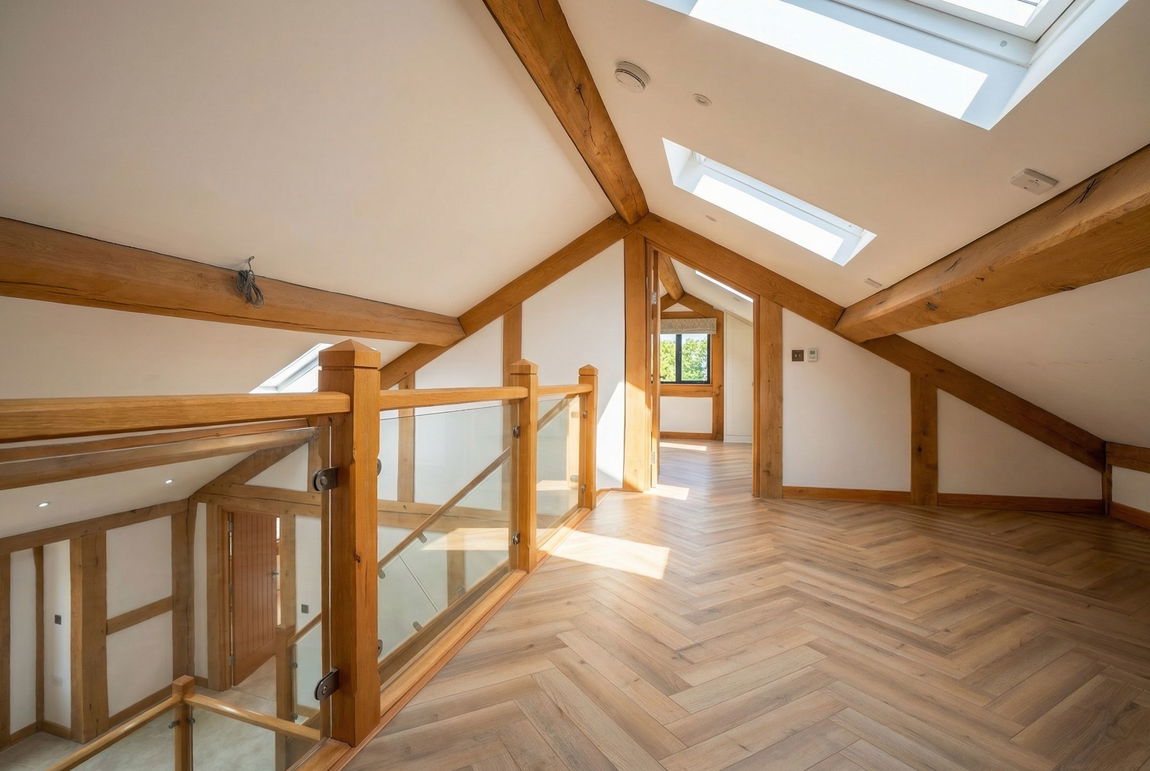 Having a Velux window to the rear elevation, ceiling spot-lights, built-in eaves storage and oak framed double glazed window to the side elevation with rectangular metal inserts