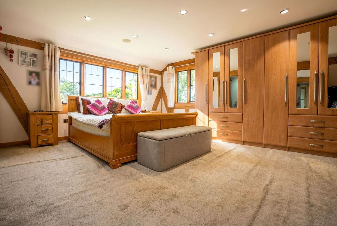 Having an oak framed double glazed window to the rear elevation with rectangular metal inserts, range of built-in wardrobes with over-bed storage, ceiling spot-lights and door returning to landing