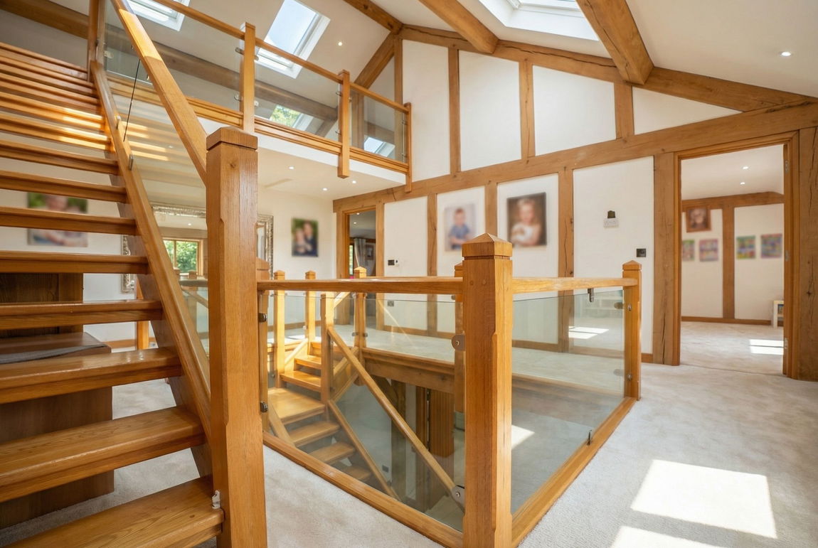Having oak framed double glazed window to the front elevation with rectangular metal inserts, oak stairs with glass inserts leading to the second floor, ceiling spot-lights and doors radiating off to: