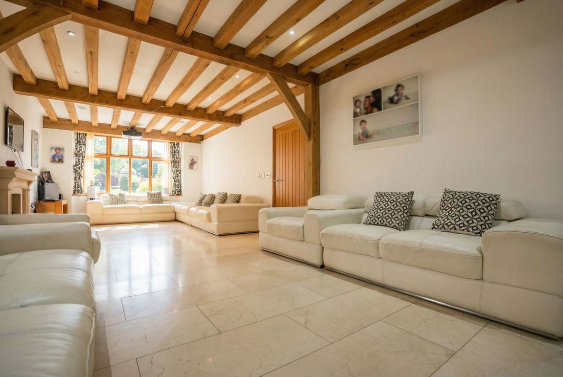 Having oak framed double glazed bay window to the front elevation with rectangular metal inserts, beams to ceiling and tiled flooring with under-floor heating