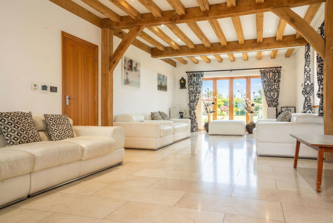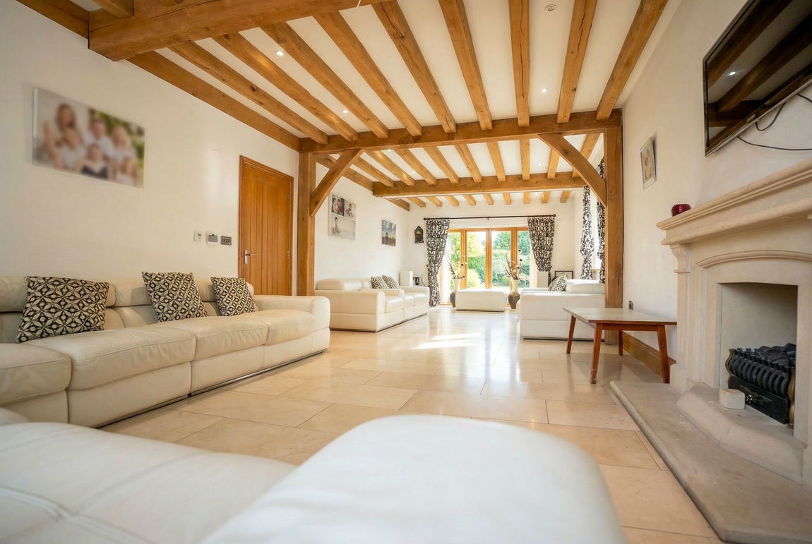 Having an oak framed double glazed bay window with rectangular metal inserts to the front elevation with oak framed double glazed double opening doors to the rear with rectangular metal inserts, tiled flooring with under-floor heating, beams to the ceiling, further oak framed double glazed window to the side elevation and stone fireplace with hearth and surround