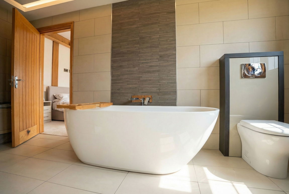 Having a bath with centralised taps and shower attachments, vanity wash hand basin with waterfall style mixer tap over, low flush WC, ceiling spot-lights, tiled flooring with under-floor heating, complementary tiling to walls and oak framed double glazed window to the rear elevation with rectangular metal inserts