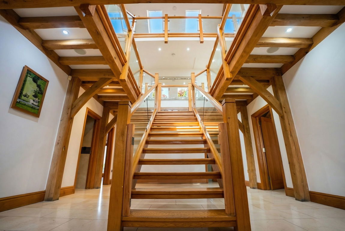 Having centralised oak and glass staircase leading to the first floor, tiled flooring with under-floor heating, ceiling spot-lights and doors radiating off to: