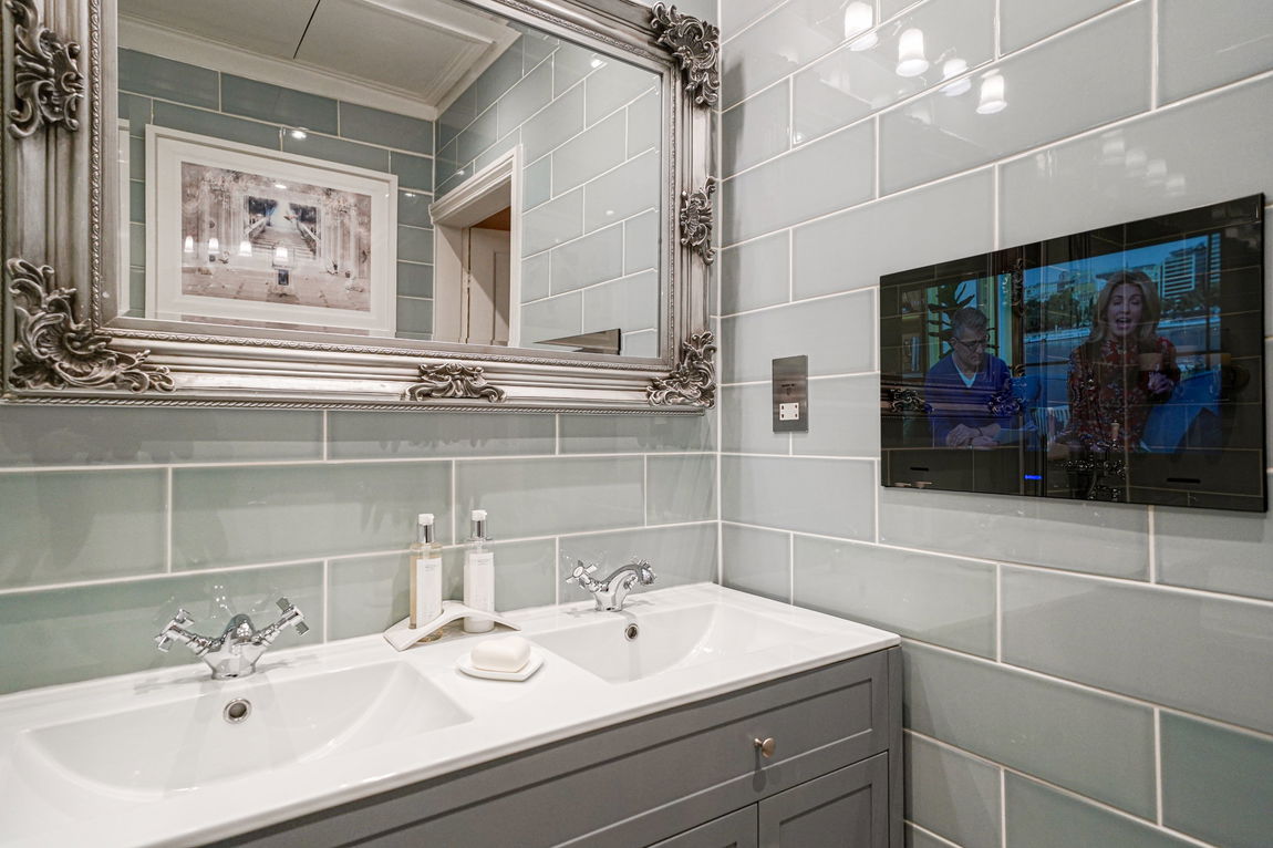 • Hotel-styled bathroom with a mirrored television with streaming options