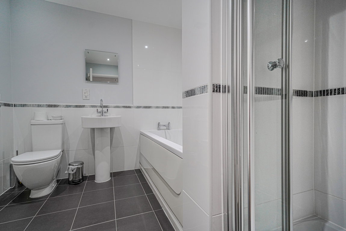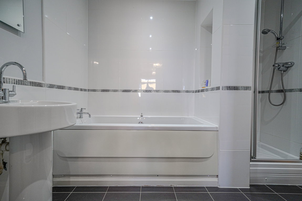 En-Suite Shower Room Being fitted with a modern white suite comprising a double shower cubicle, two pedestal wash hand basins, low level W.C, ceramic tiled flooring and complementary wall tiling, recessed ceiling spotlights, extractor fan and heated towel rail