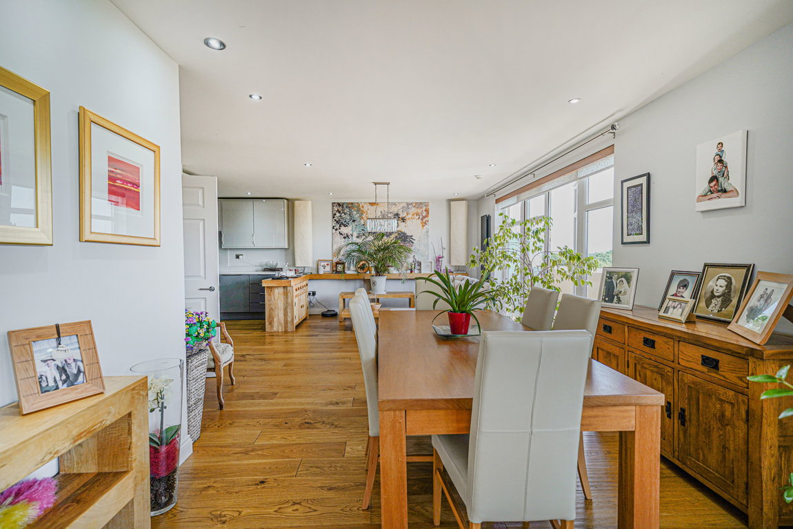 Large Open Plan Wrap Around Lounge and Dining Area 38' 10" x 25' 0" max (11.84m x 7.62m max) Having three sets of French double glazed doors opening to the balcony, Oak flooring, three central heating radiators, recessed ceiling spotlights, door to master bedroom and opening to