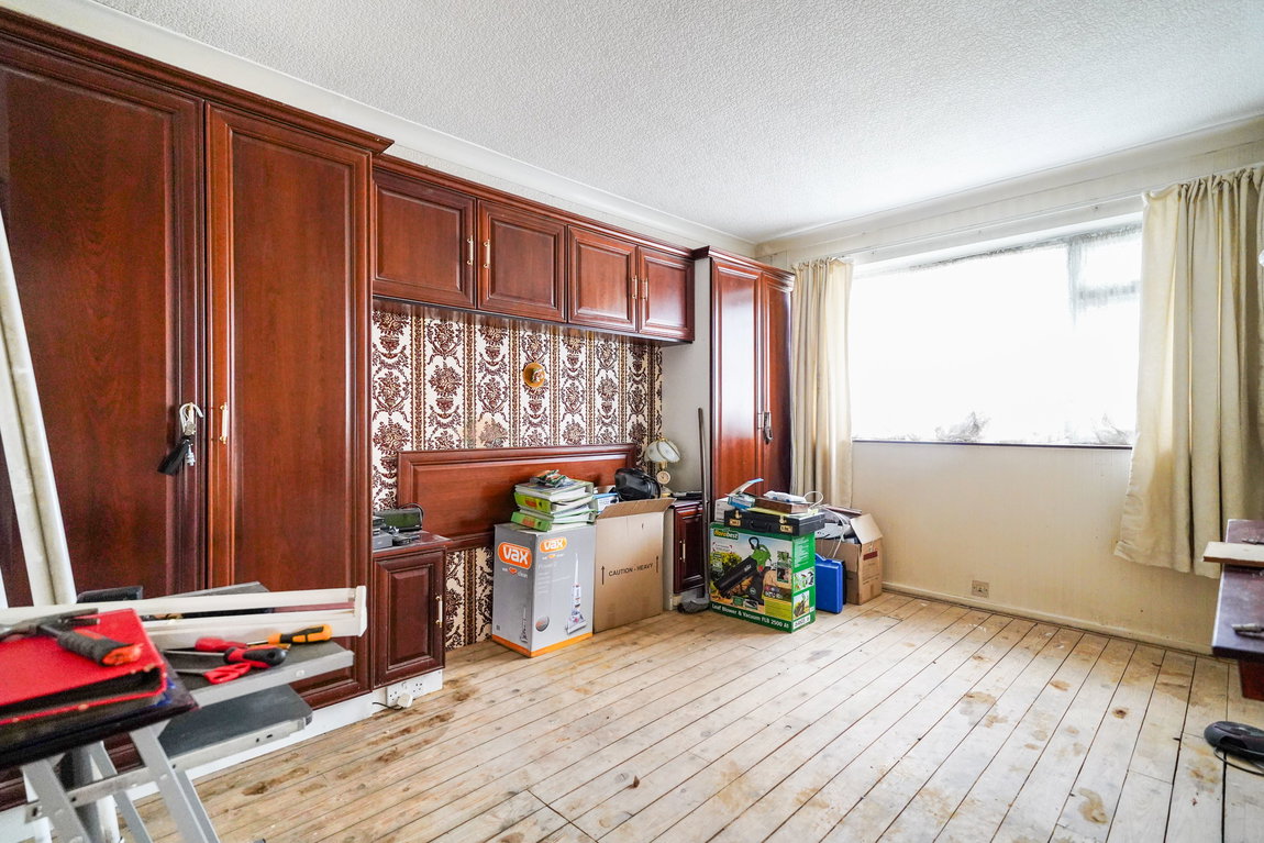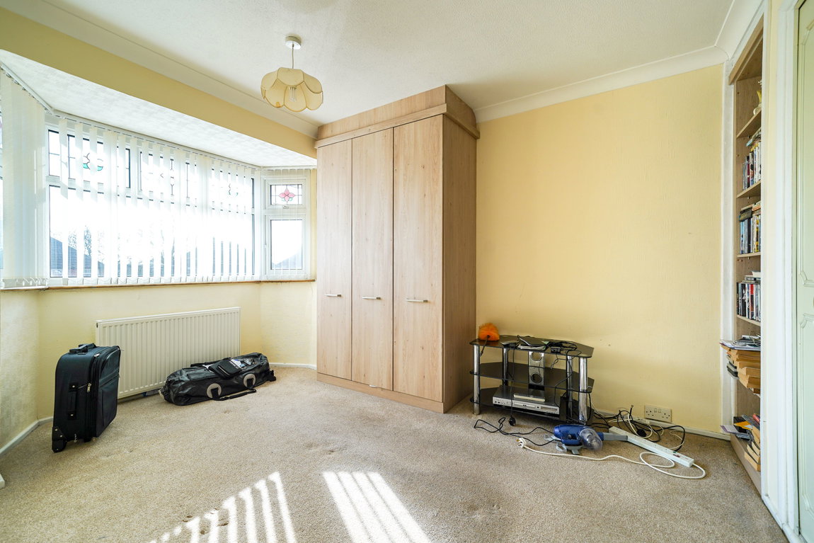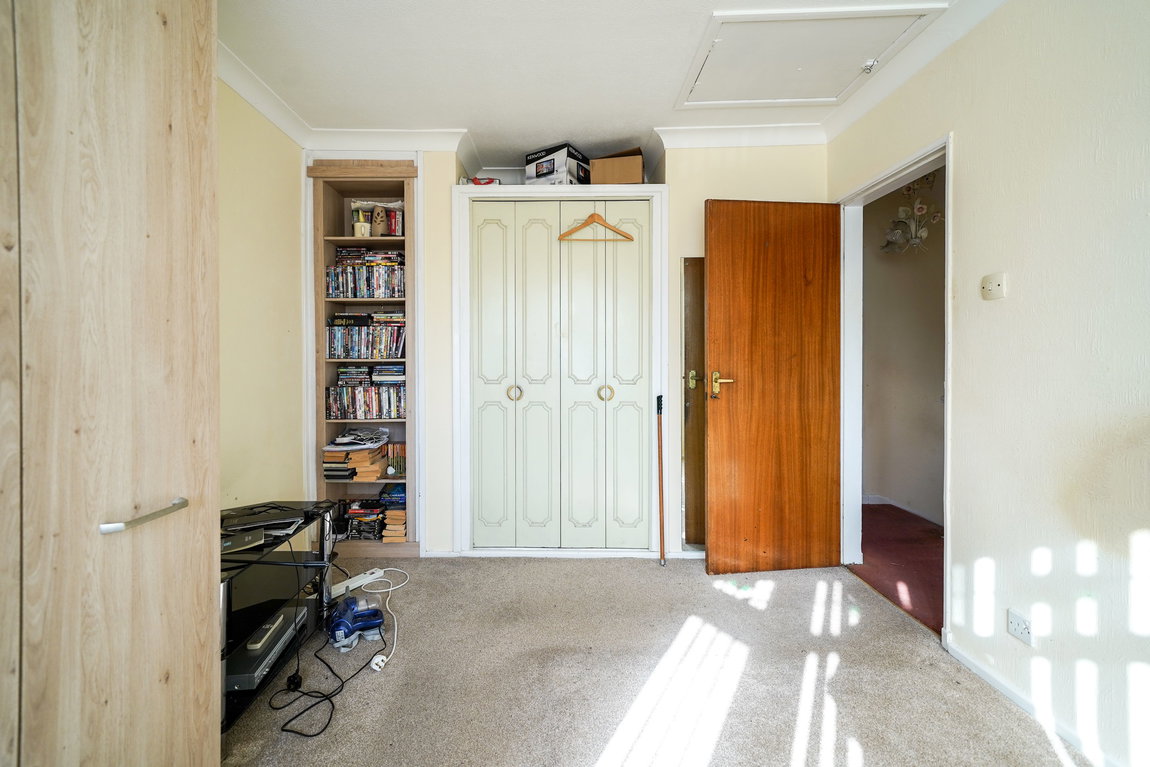 With double glazed bay window to front elevation, radiator, ceiling light point, fitted wardrobes and storage and loft hatch