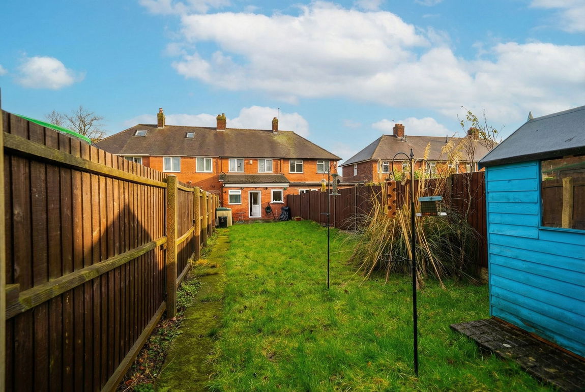 Being mainly laid to lawn with paved patio area, timber storage shed, fencing to boundaries and planting
