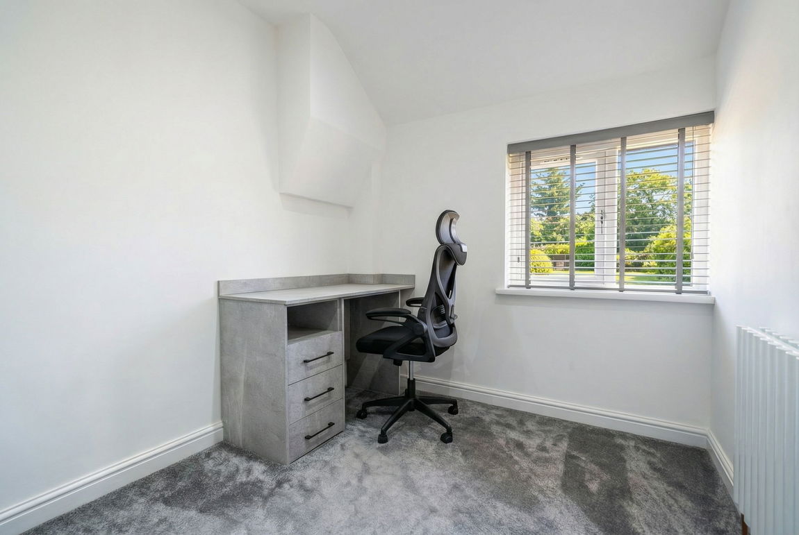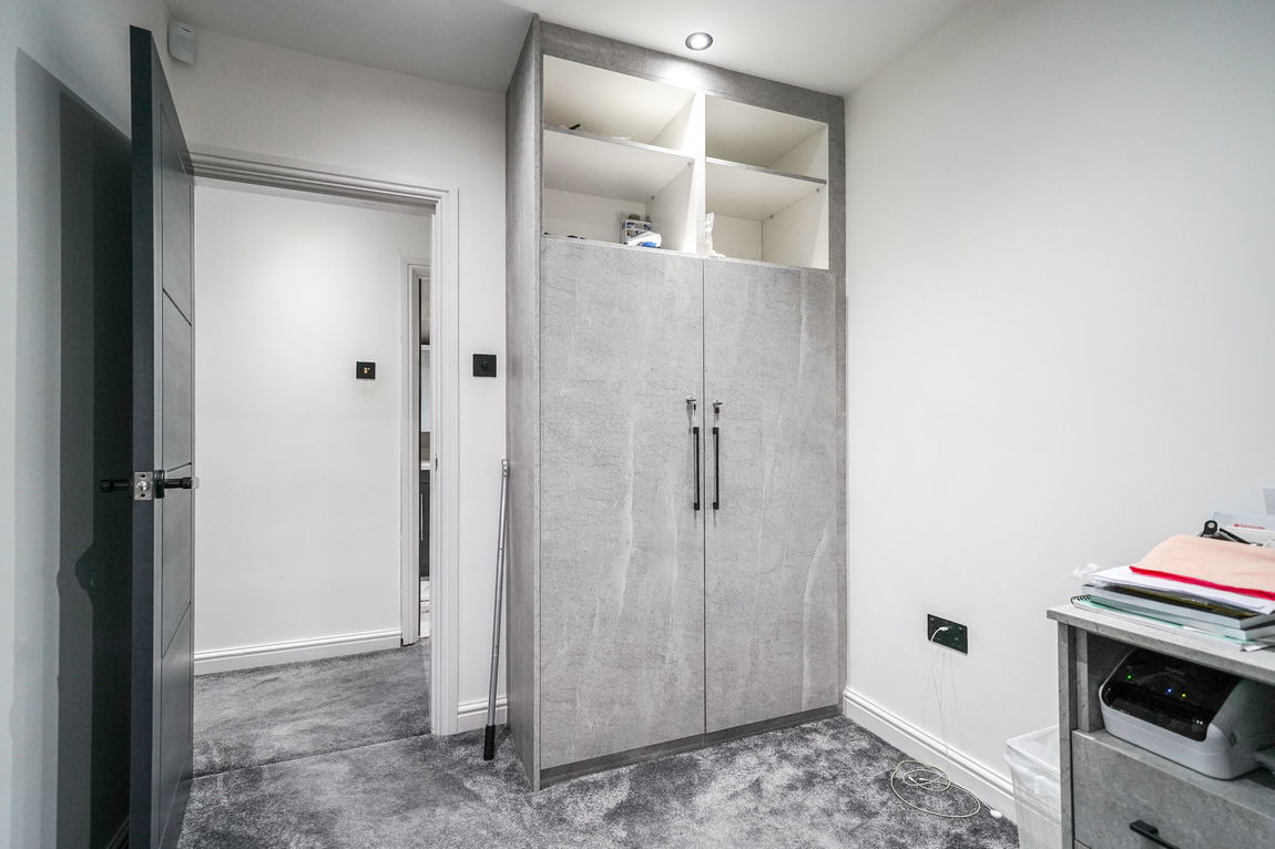 With double glazed window to rear elevation, fitted wardrobes and workspace. contemporary radiator and ceiling spot lights
