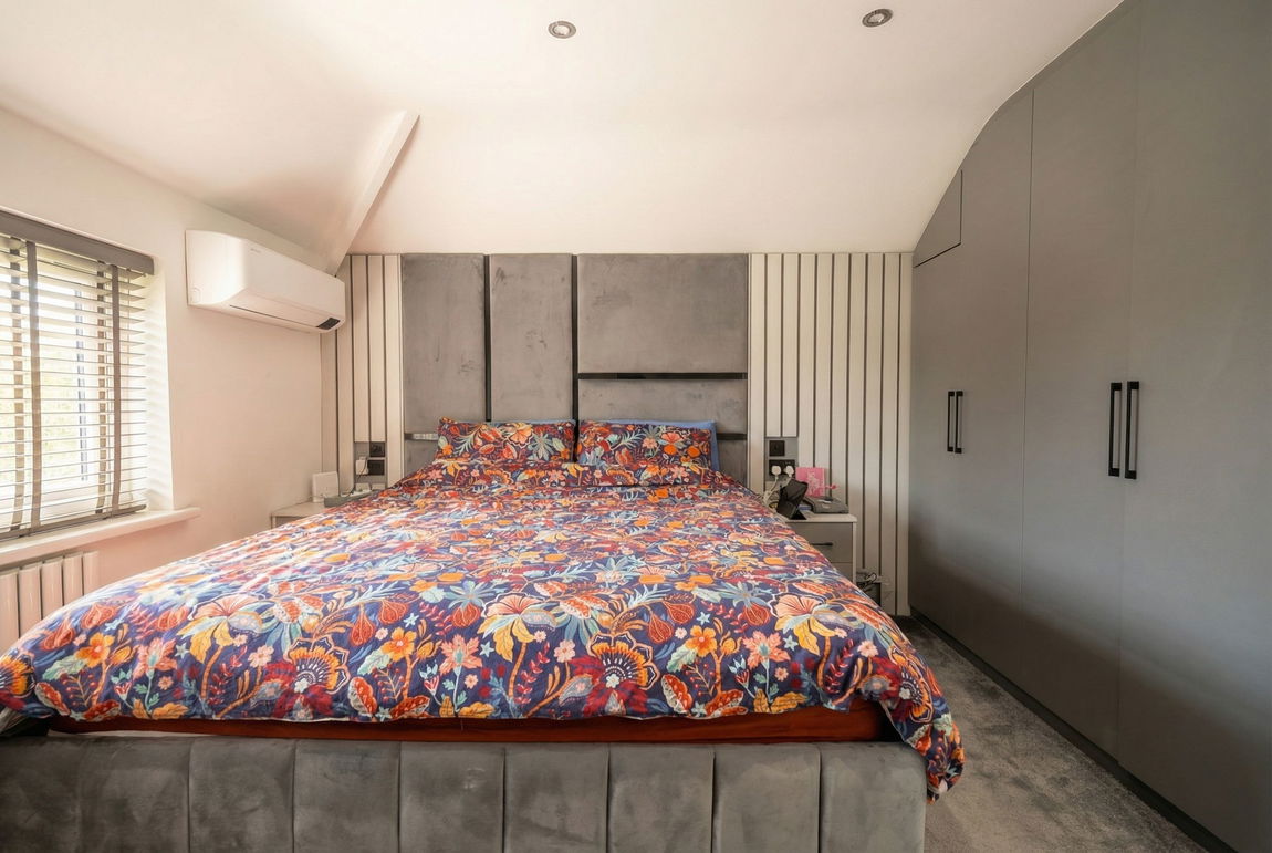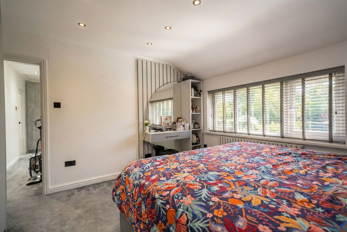 With double glazed window to front elevation, two double fitted wardrobes, air conditioning unit, panelled wall with fitted drawers and vanity mirror, contemporary radiator and ceiling spot lights